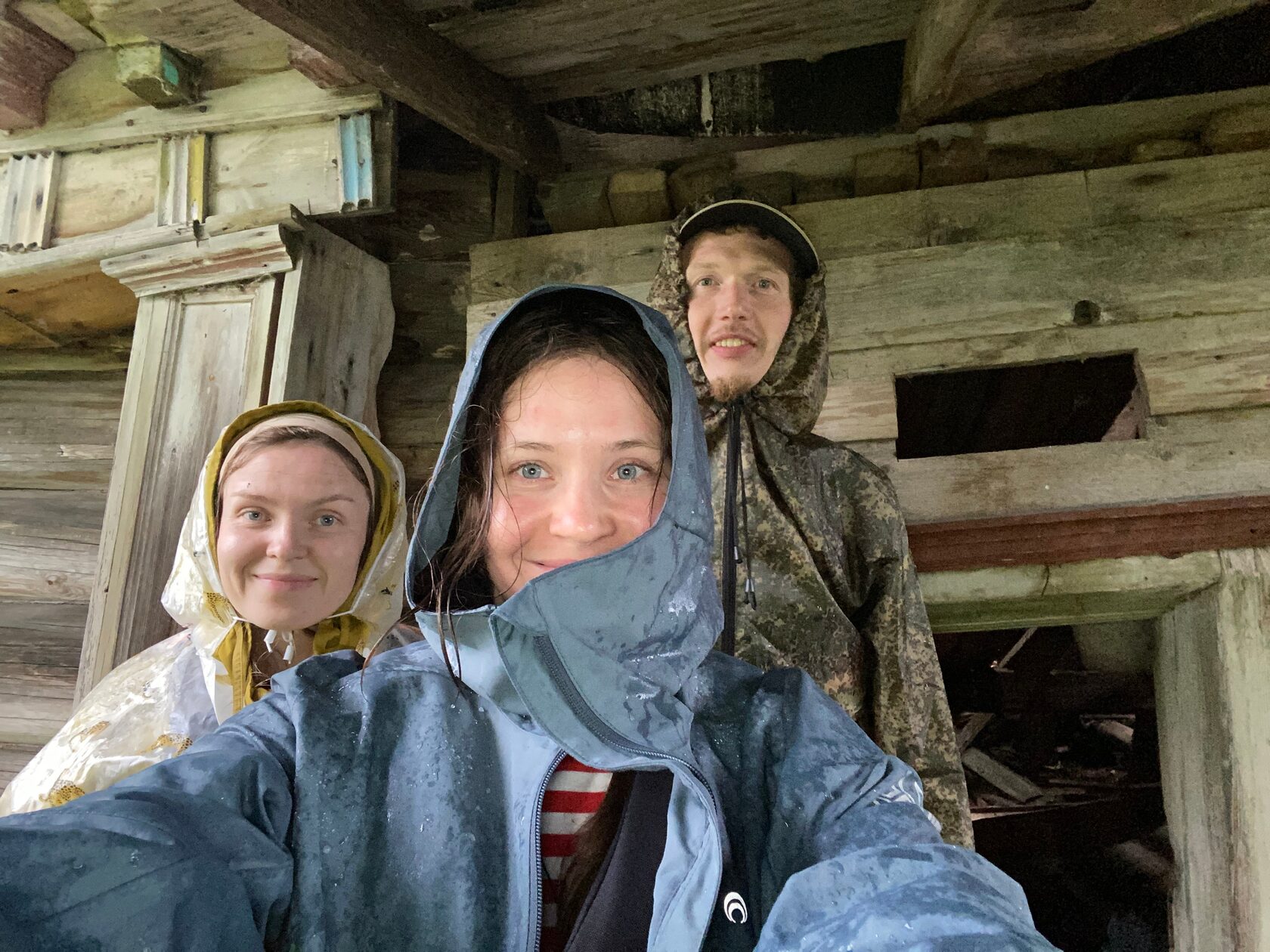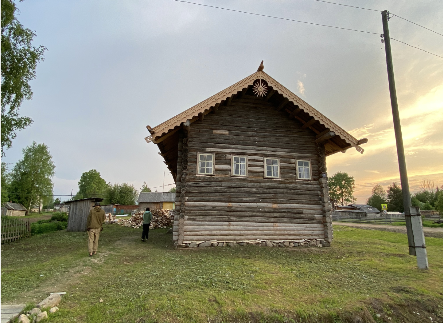 Оставили карбаса в Усачёво на ночь. Там же ночует команда лодьи «Поветерь» в палатках. Отправились в Архангело на двух машинах, где разгрузили вещи в курной избе, которую отреставрировал Саша Матюхин с командой плотников.