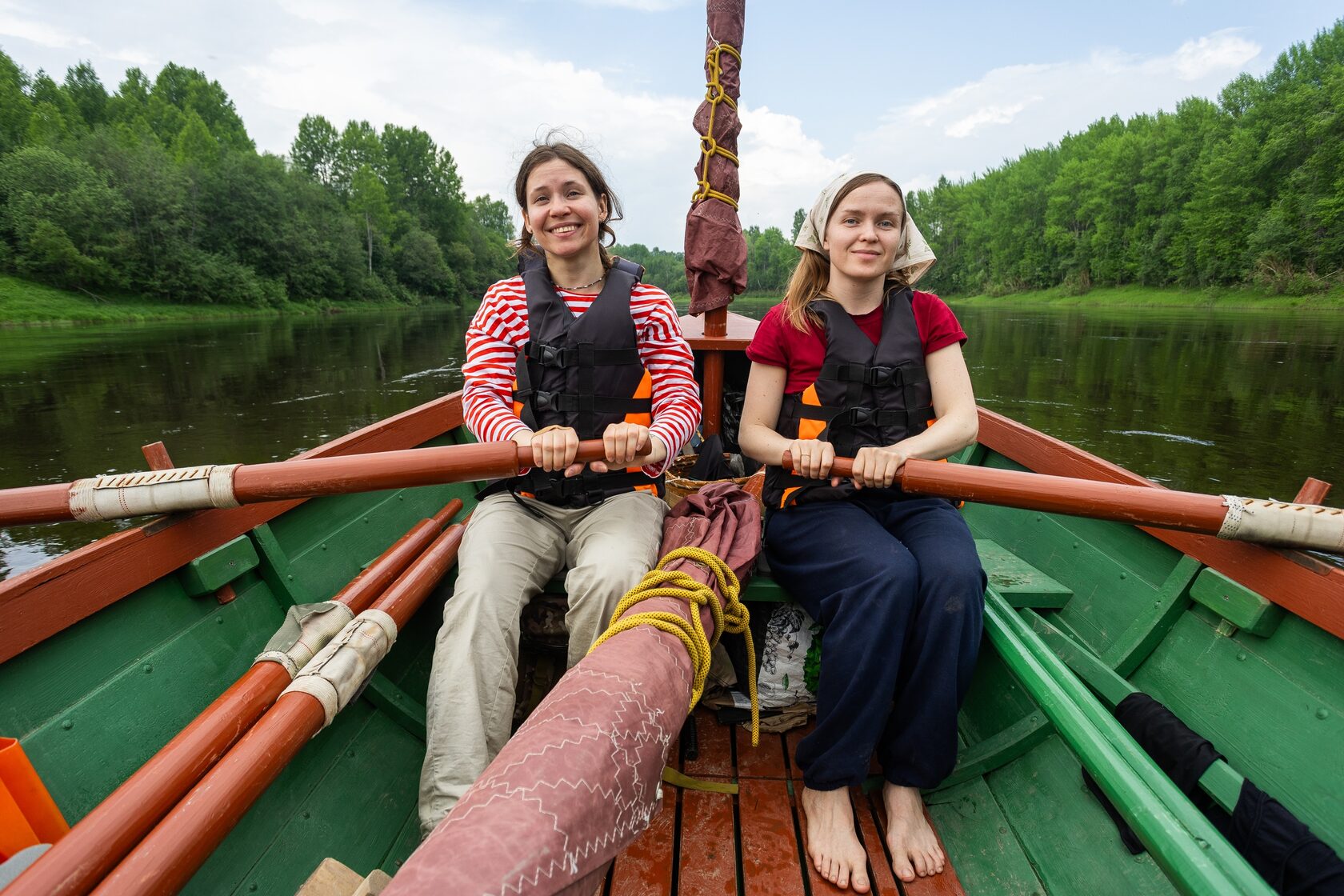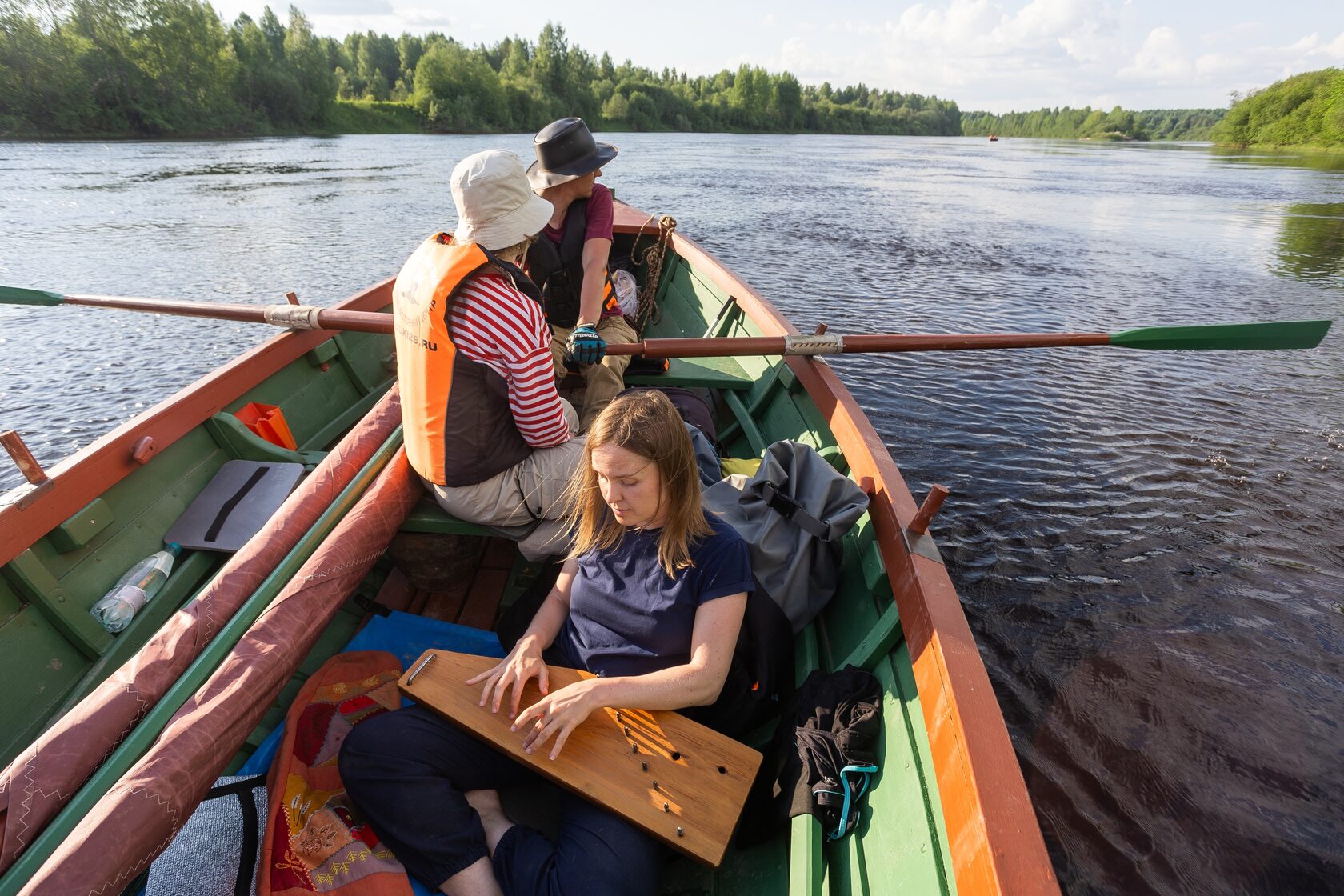 18:20 Осталось 14 км до Усачёво — конечной точки дневного перехода. Миша и Саша бодренько гребут на веслах. Катя поигрывает на гуслях.