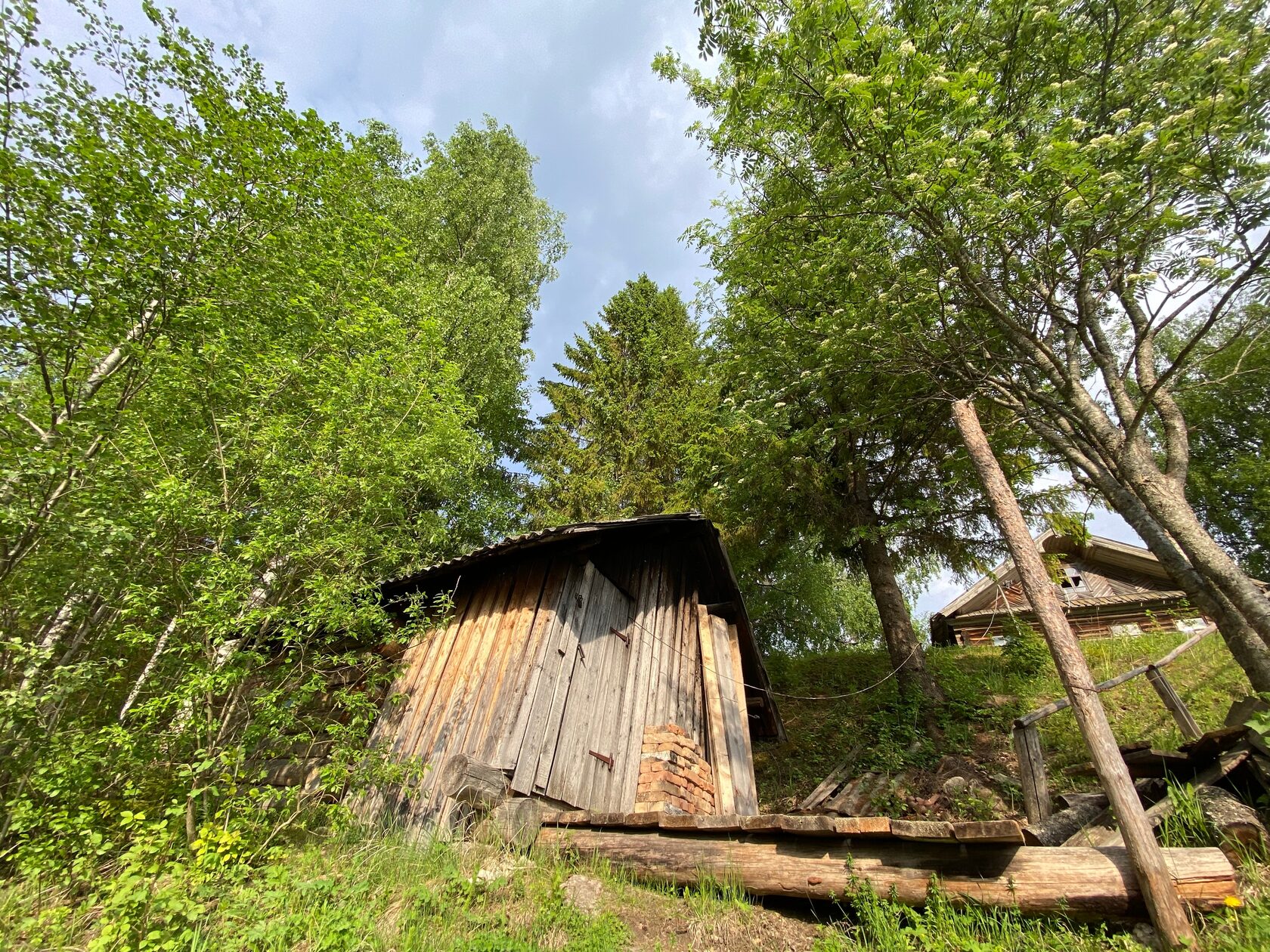 16:40 Началась сильная гроза с молниями и громом. Вымокли изрядно. Идём осторожно, под берегом, мачты сняли. Через какое-то время прибыли в Полутино, посмотрели два оставленных дома. В одном из них — лодка традиционного каргопольского пошива: плоское дно, набранное из трёх досок, и борта, почти вертикально пришитые к днищу. Конструкция простая до гениальности. Но её было плохо видно. Рядом с другим домом было синее весло.