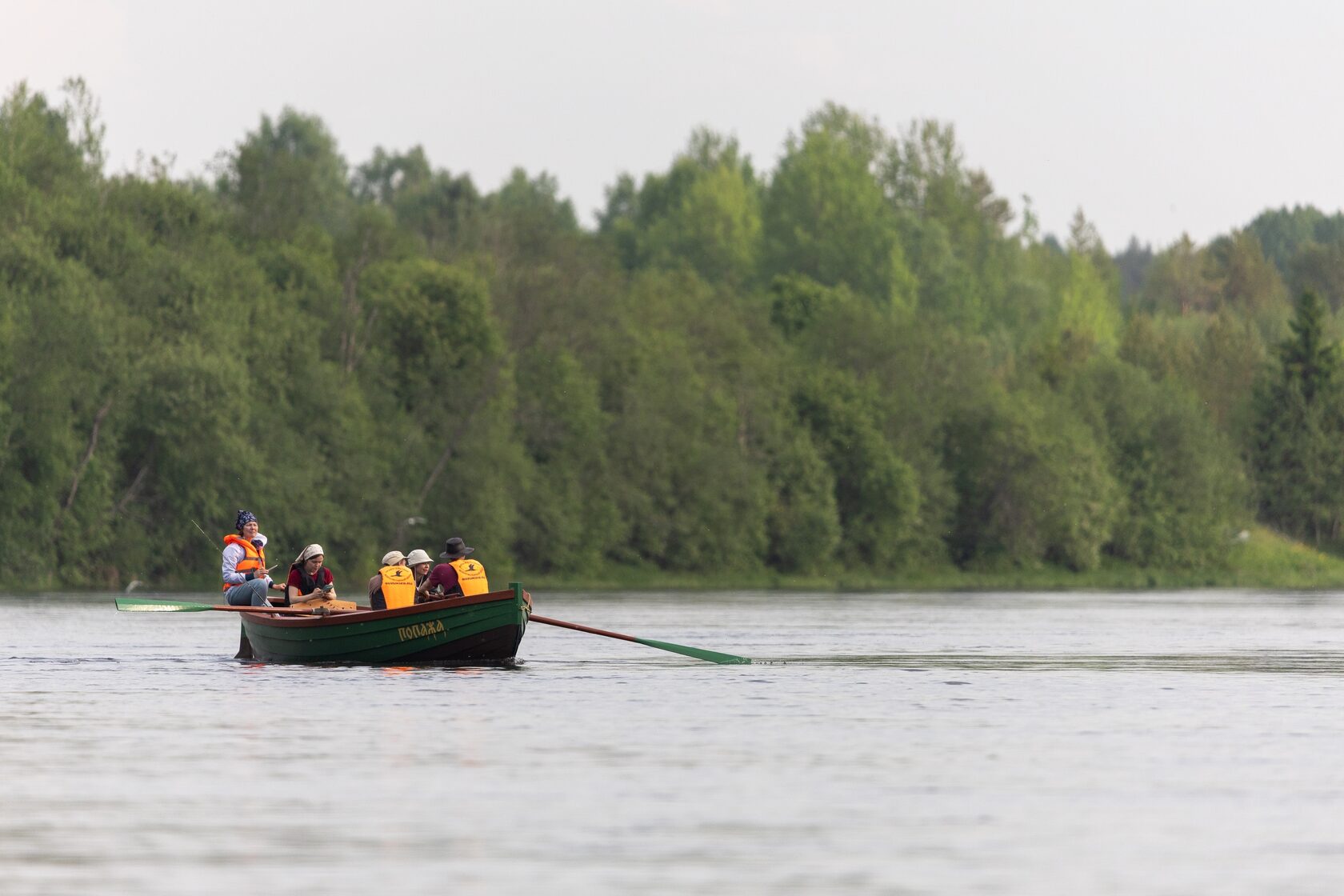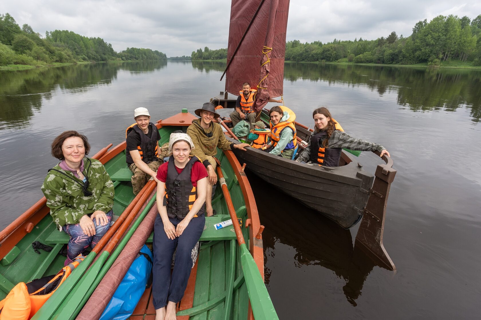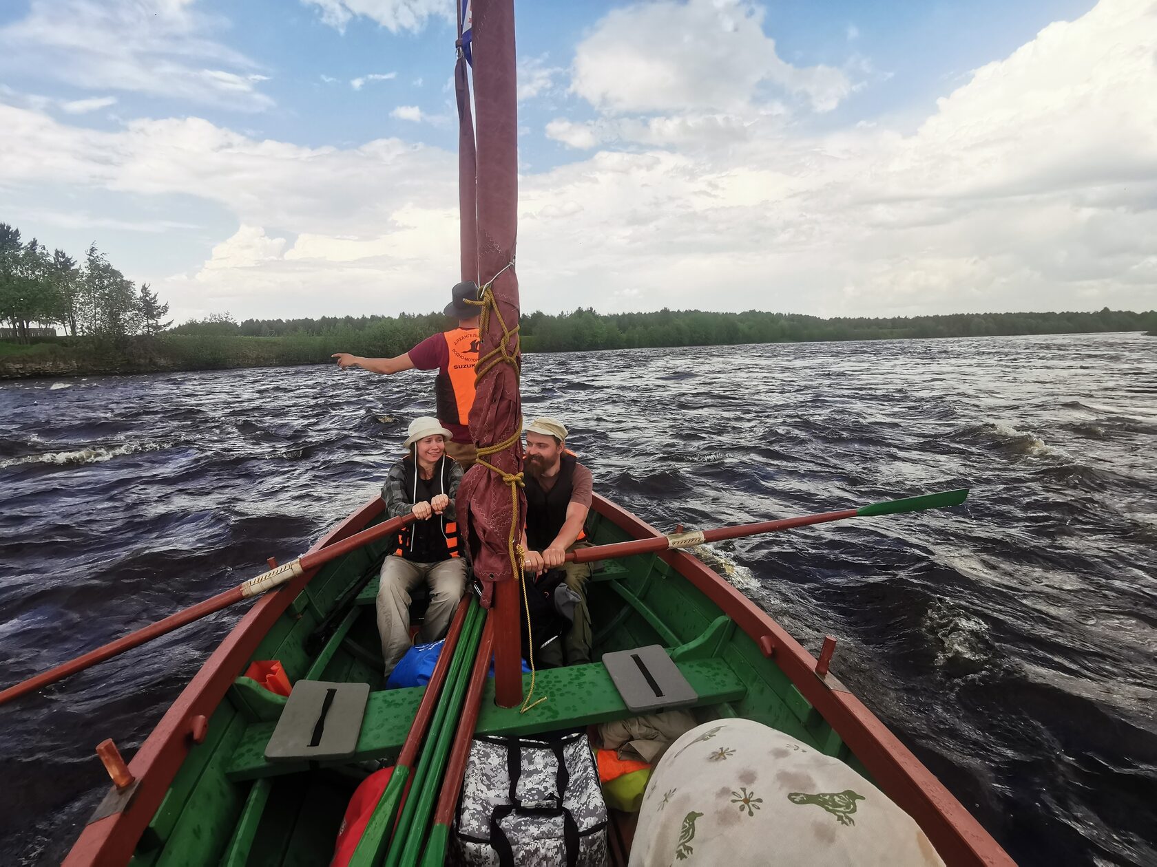 9:15 Вышли из Архангело двумя карбасами. «Попажа»: Миша, Катя, Мэри. «Пошто»: Егор, Лена, Илья, Андрей. Миша Крупенин договорился: вещи привезут на машине к переправе в Конево, идём налегке. Погода хорошая, лёгкий ветерок арктической прохлады и бережное солнышко сквозь облака. Договорили о вахте: Миша гребёт час, Катя с Мэри полчаса. Все согласны, все довольны. Мэри говорит, что на вёслах становится скучно, просыпается егоза, потому что не видно, что впереди лодки. А потом егоза успокаивается, и приходит смирение и умиротворение.