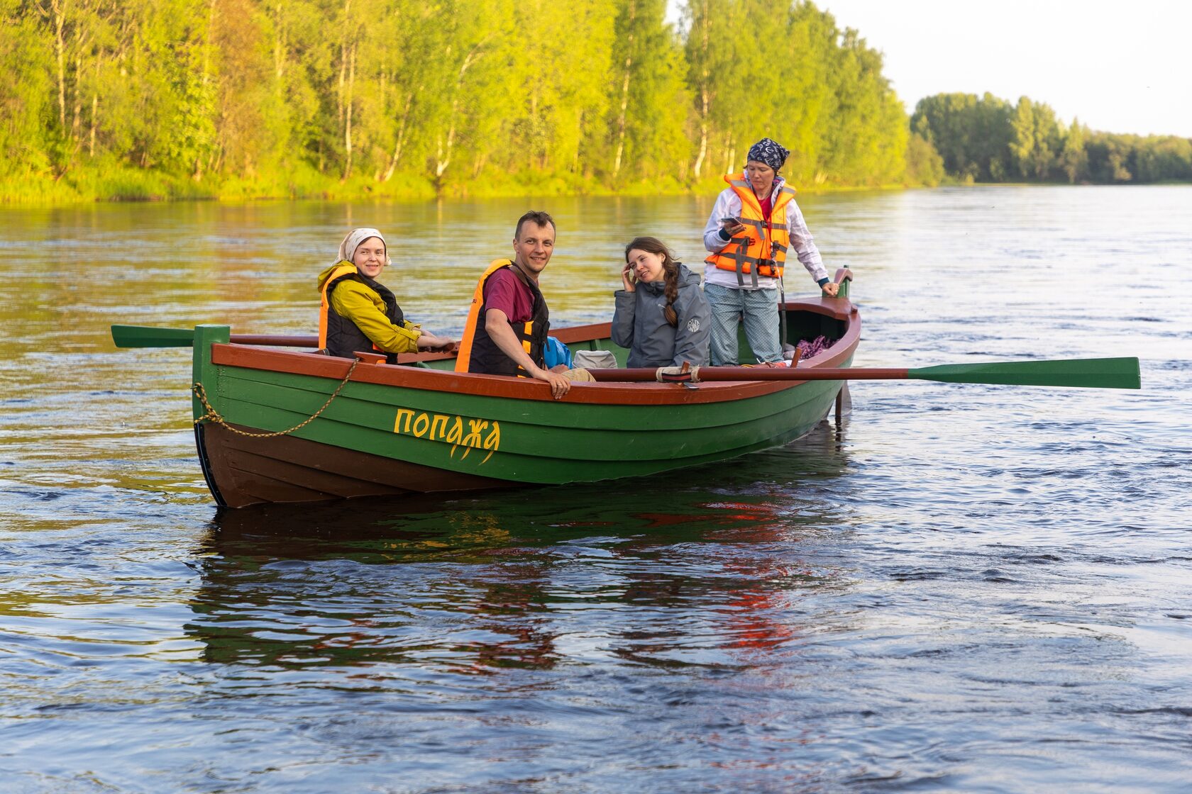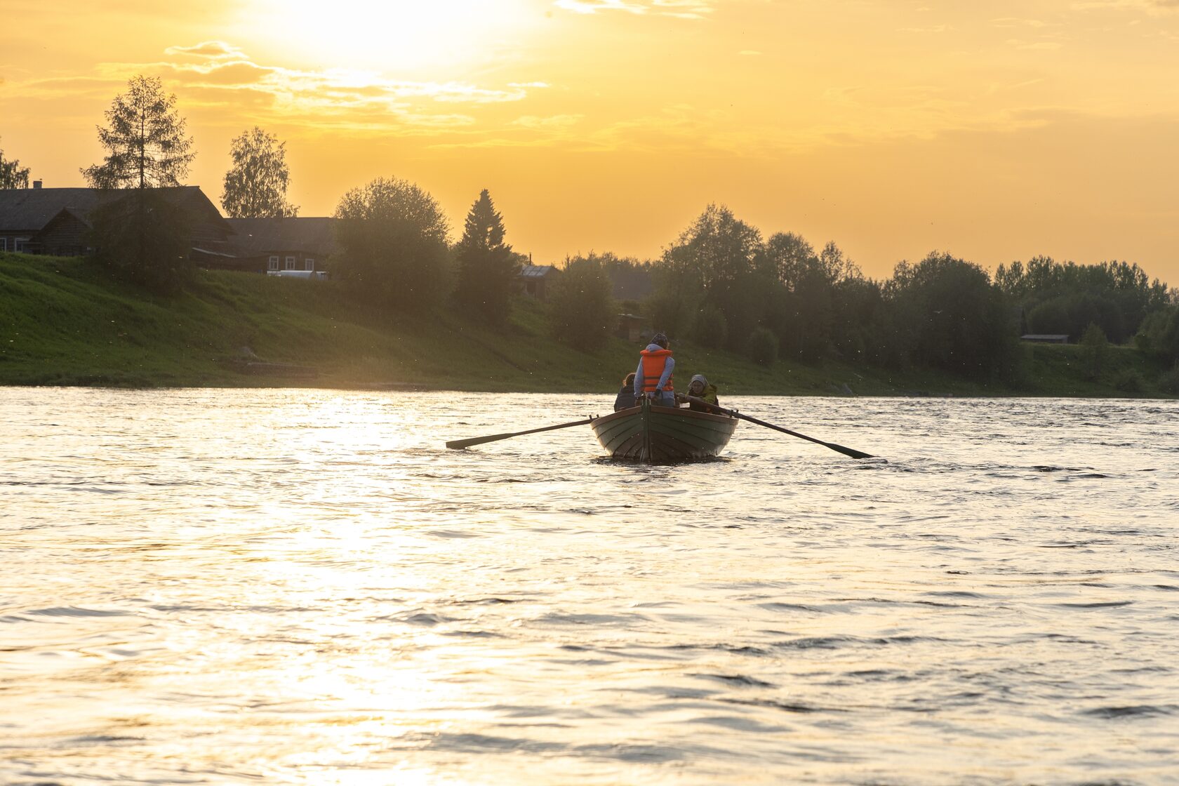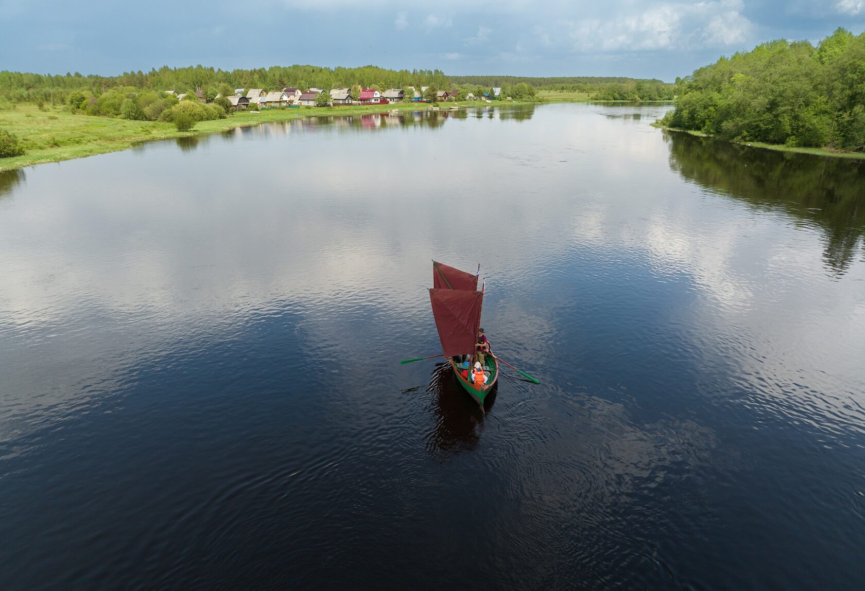 9:15 Вышли из Архангело двумя карбасами. «Попажа»: Миша, Катя, Мэри. «Пошто»: Егор, Лена, Илья, Андрей. Миша Крупенин договорился: вещи привезут на машине к переправе в Конево, идём налегке. Погода хорошая, лёгкий ветерок арктической прохлады и бережное солнышко сквозь облака. Договорили о вахте: Миша гребёт час, Катя с Мэри полчаса. Все согласны, все довольны. Мэри говорит, что на вёслах становится скучно, просыпается егоза, потому что не видно, что впереди лодки. А потом егоза успокаивается, и приходит смирение и умиротворение.
