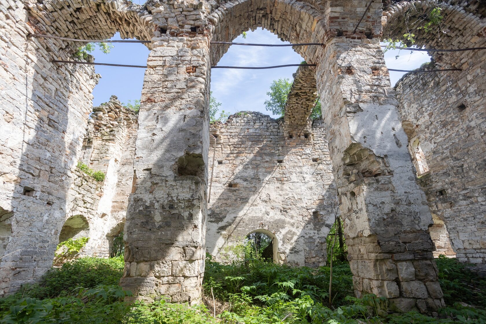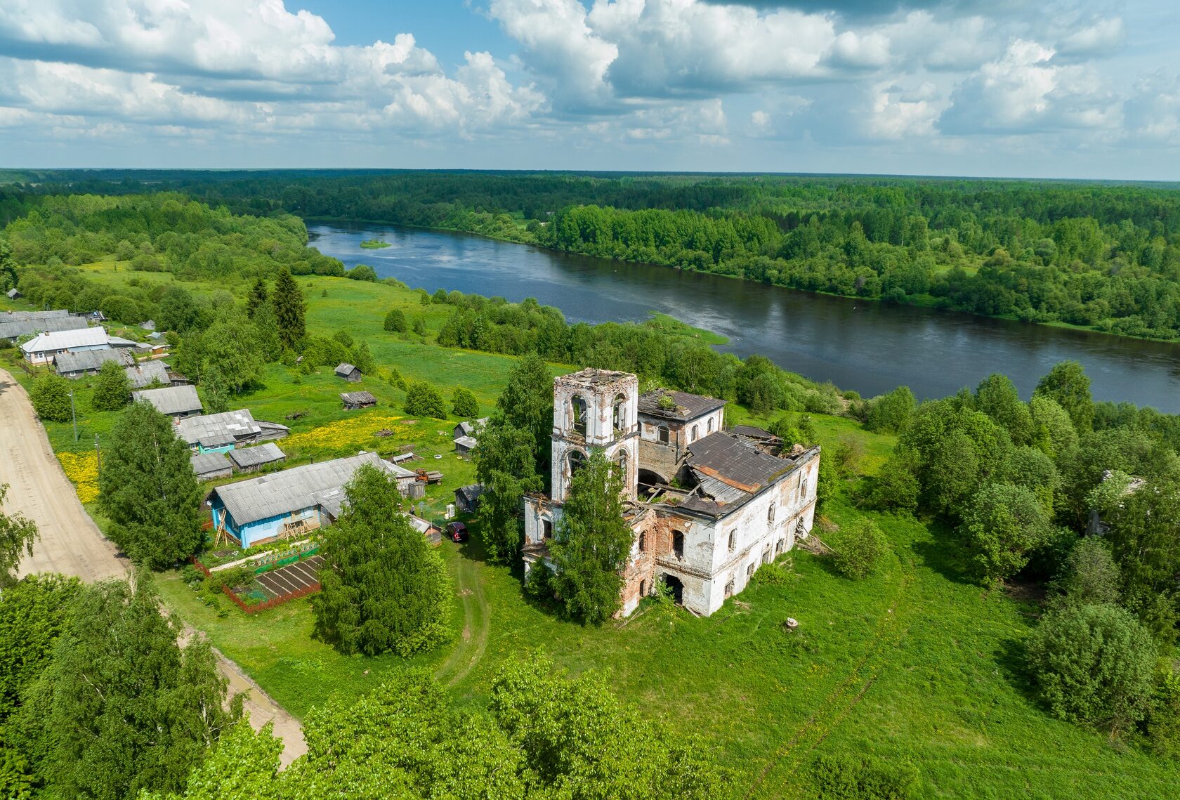 Оглядели руины каменных храмов с колокольней. Жилая деревня. Разрушенные храмы оказывают впечатление не меньше, чем действующие. А иногда и больше. Церковь Рождества Христова (XVIII век) с колокольней сохранила своды, она более суровая. В храме поменьше (Церковь Троицы Живоначальной) кажется, более древние стены и своды, они сложены из камней разной формы. Тонкие росчерки арок висят в воздухе, своды обвалились и теперь сад растёт внутри храма.