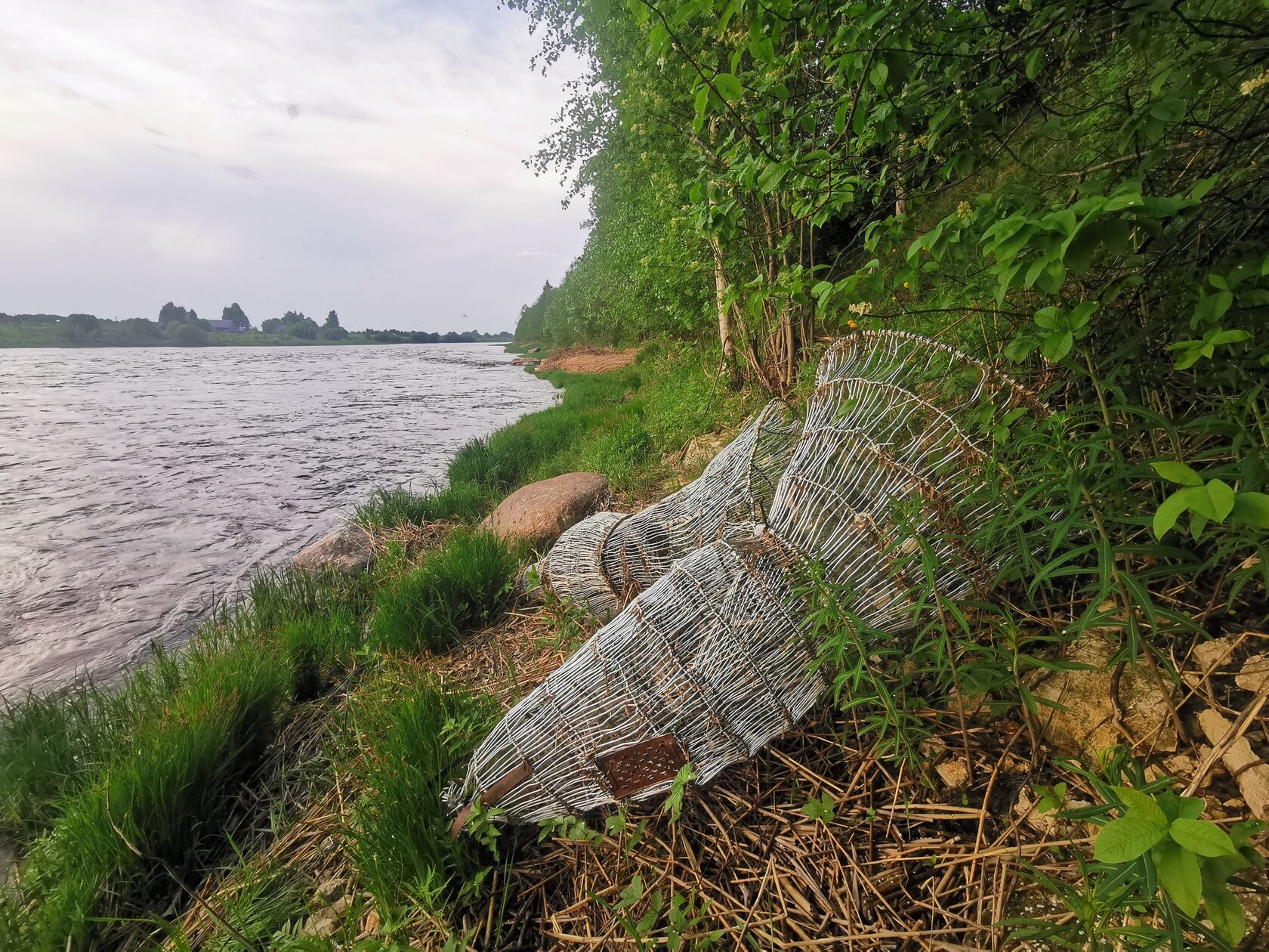 17:10 Прошли два порожка. Миша объясняет: «Если вода черная — глубина. Если коричневая — может быть близко дно». По краям видны камешки, бурлит вода. Живописные рыболовные снасти на берегу (морды/вёрши/рюжи). «Попажа» обошла «Пошто» (с которого велась съёмка) и «Поветерь», которая пришвартовалась к лесочку, идём первыми.