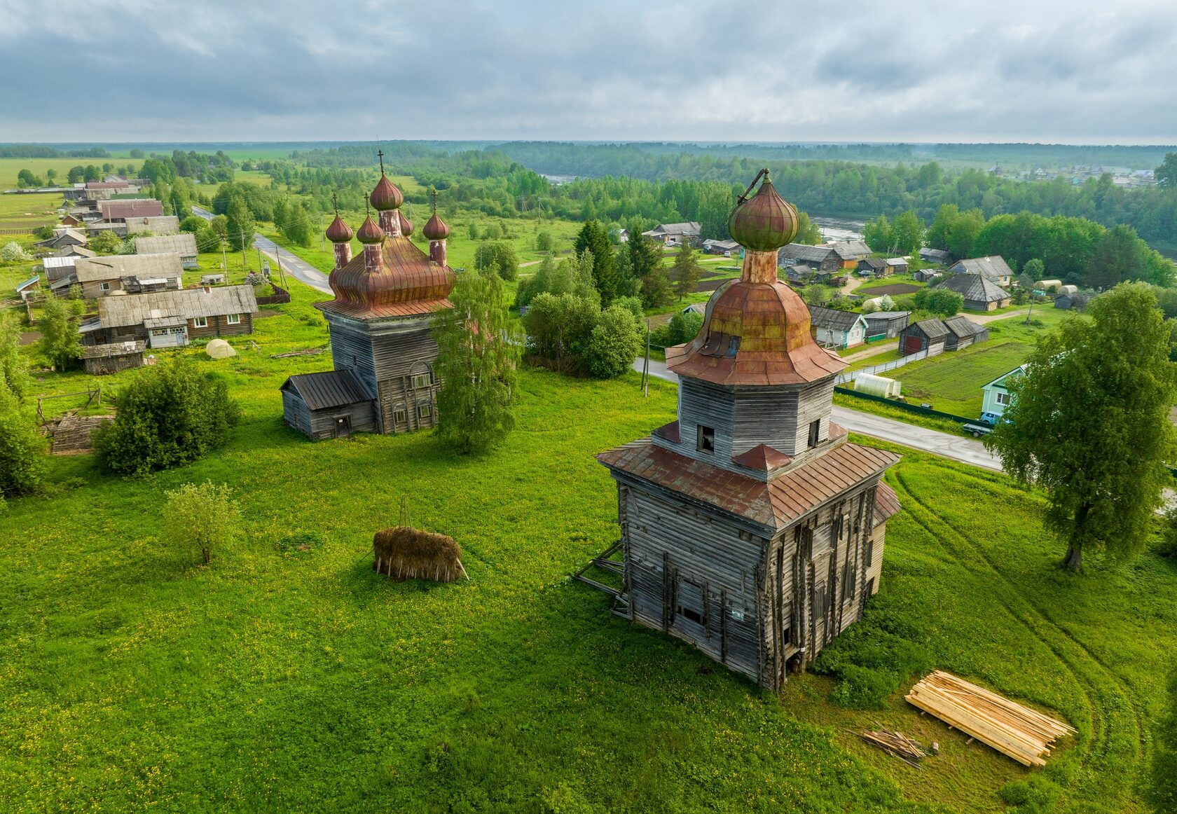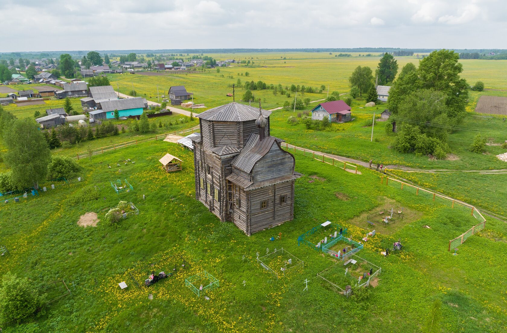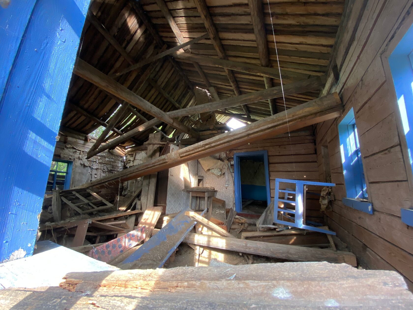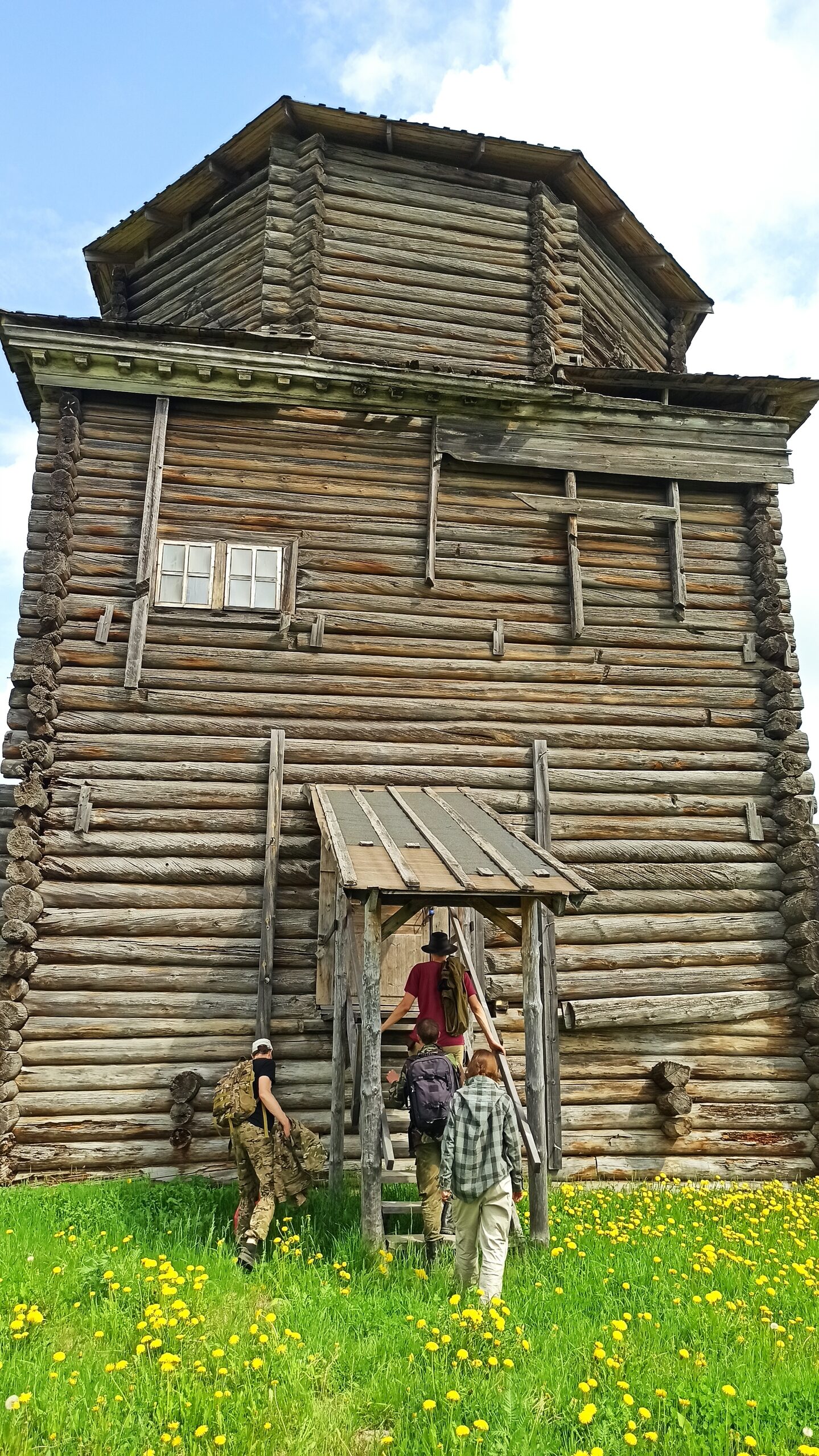 13:20 Зашли в церковь, в ней много лесов строительных внутри. Старые брёвна церкви сгнили, их будут заменять. Деревне меценатом подарен лес на реставрацию.