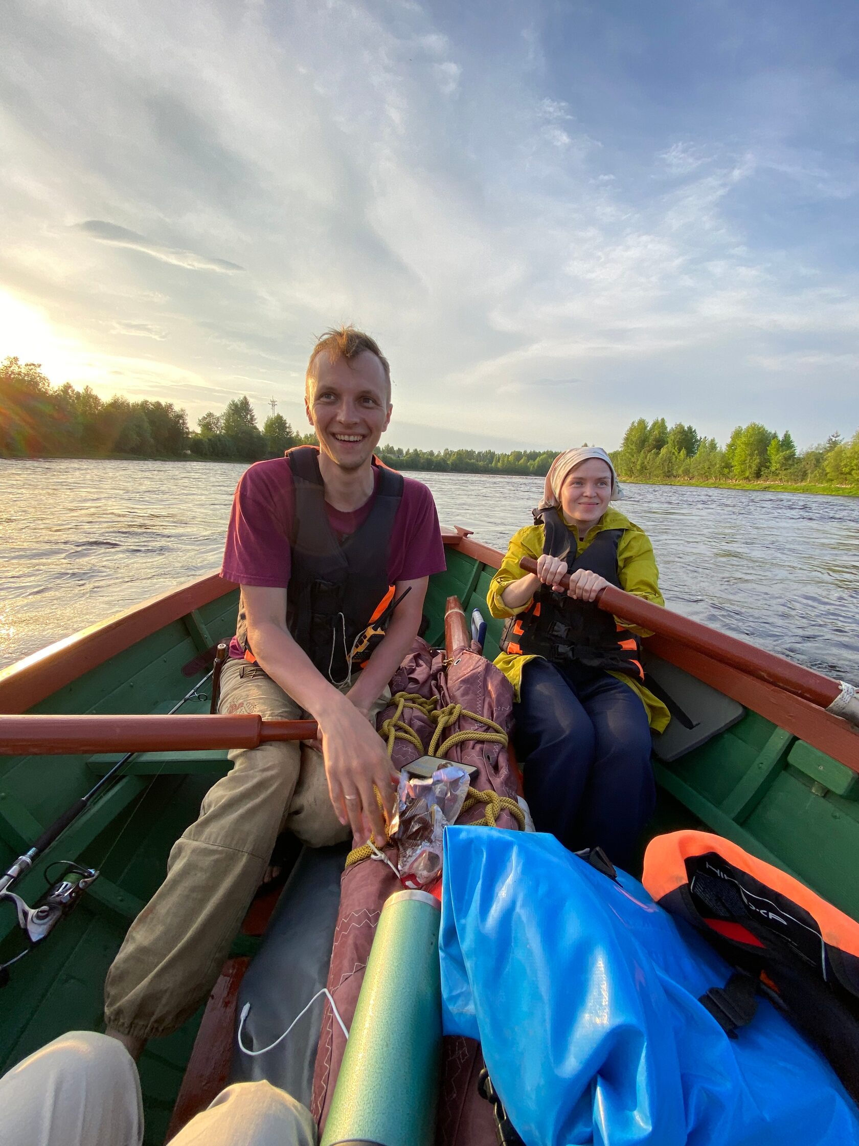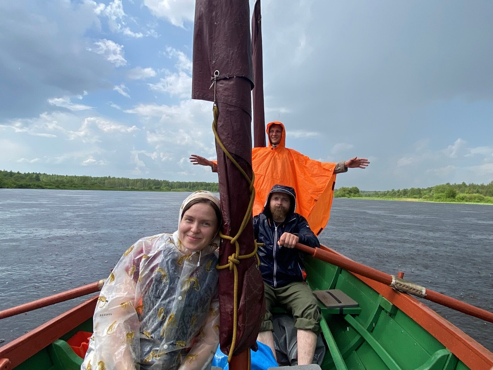 16:10 Отплыли. Катя и Маша на вёслах. Миша с Катей спели народную песню «Из-под камушка».