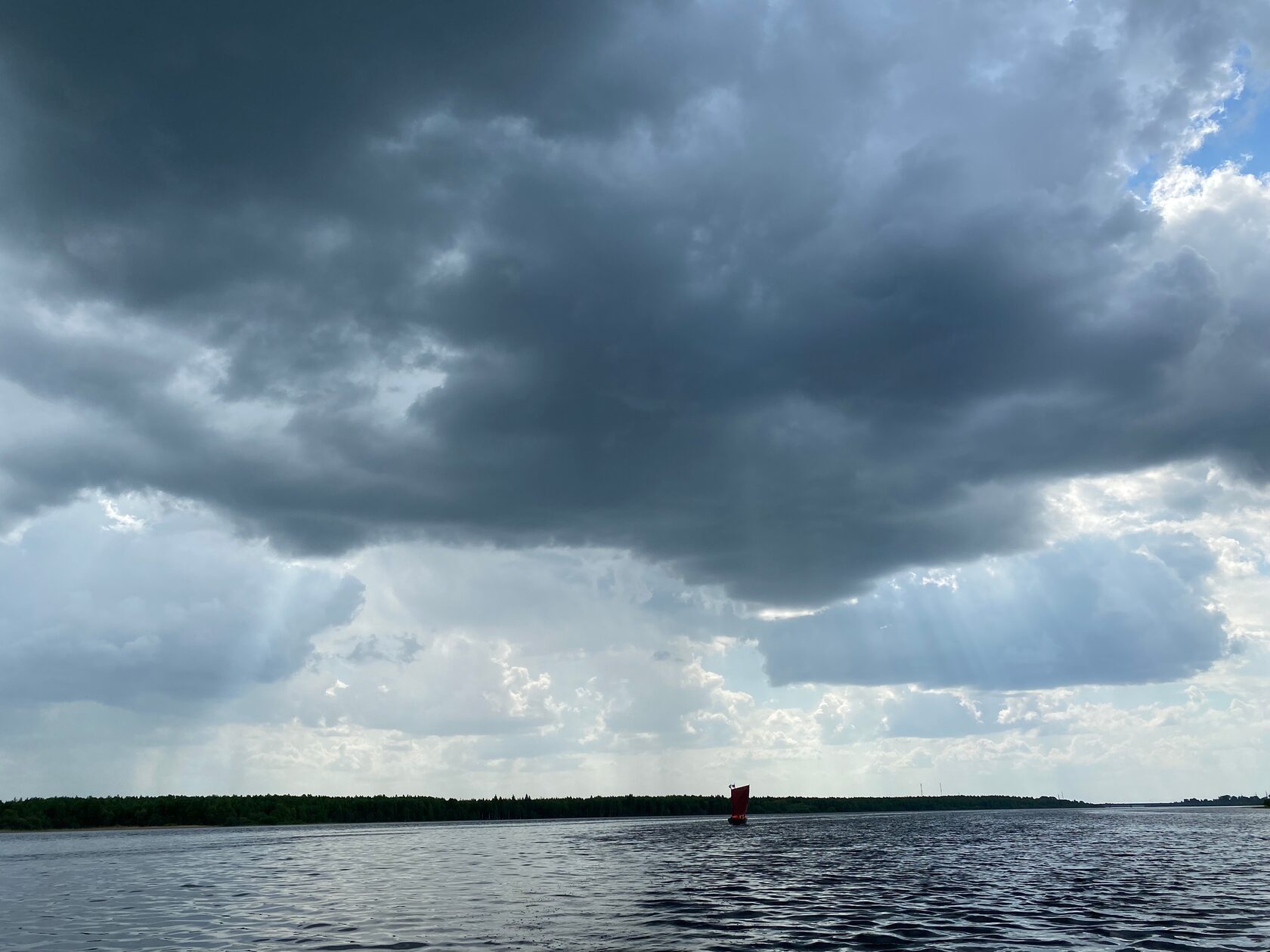 18:05 Гремит гром, лёгкий ветерок. Скорость течение реки 7 км/ч, скорость на веслах 12 км/ч.