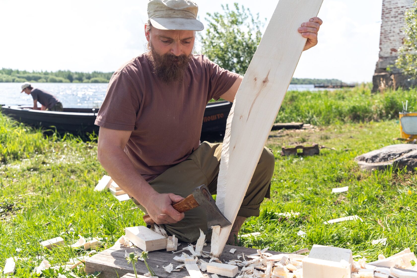 Утром закупили продукты на 3 дня пути. Изготовили для одного из карбасов слани (деревянный настил, служащий полом лодки), которые забыли в Архангельске. Слани получились отличные! Всех взбодрила необходимость проявить смекалку и возможность помахать топором. Настроение приподнятое.