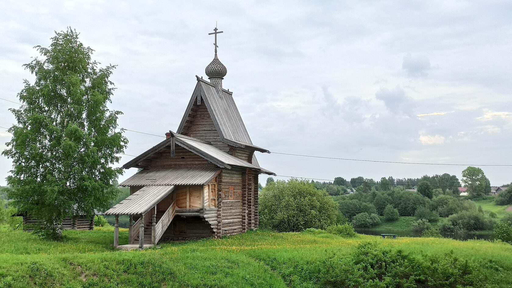 12:30 Пришли в Волосово, здесь красивая старинная церковь Николая Чудотворца (1670 года постройки) с погостом, шатер не сохранился. Егор с уснувшим Илюшей остались у лодок. Остальные пошли гулять по деревне, любоваться затейливым убранством домов: сохранившейся росписью и деревянными элементами.