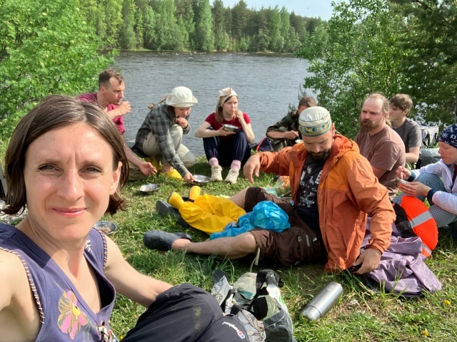 14:12 Пришвартовались у левого высокого бережка после порогов. Привал на обед. На берегу было множество лягушат. Сварили гречку с тушёнкой, нарезали огурцы и помидоры. Согрели чай (печеньки, мармелад). Катя сыграла на гуслях «Журчит корма кипучая» (песню дуэта КОКОРА).
