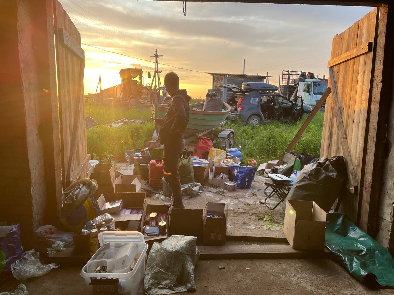 20:00 осмотрели перезимовавшие в коровнике лодки и туристическое оборудование. Делили провиант и инвентарь на два параллельных похода.