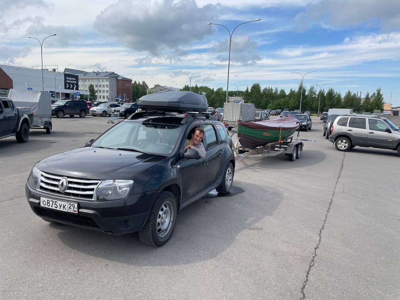 11:00 выехали с верфи. Погода на заглядение: после двух недель мороси и хмари в Архангельск наконец заглянуло солнце, прижав нас своим жаром к креслам дастера. По пути из города докупили тент для карбаса и моторное масло для лодочных моторов. Тент возложили на груженую лодку, притянули его строптивыми стяженями и обернув ее веревкой, заведенной под планширь.