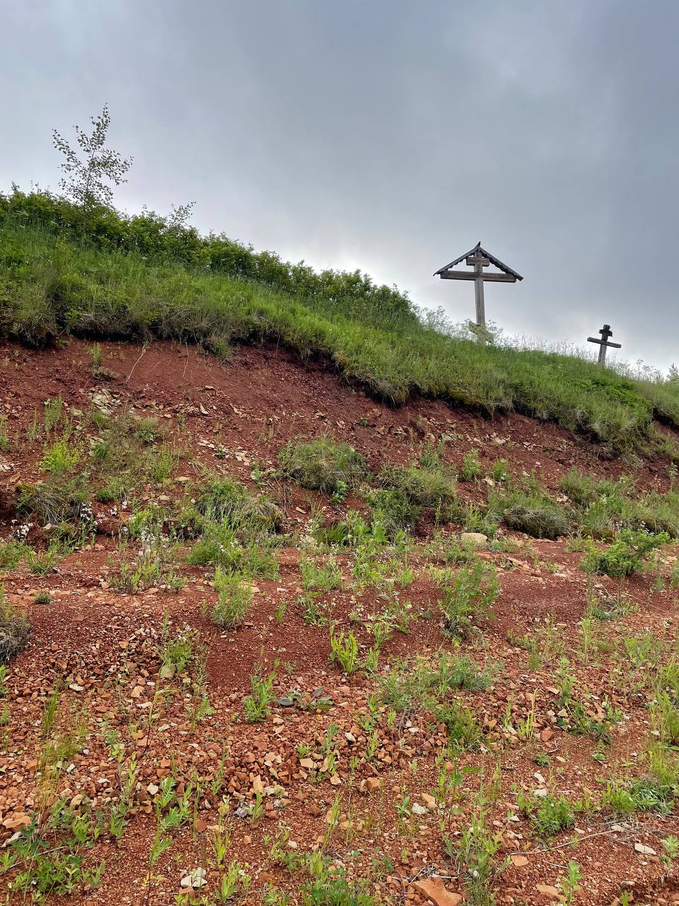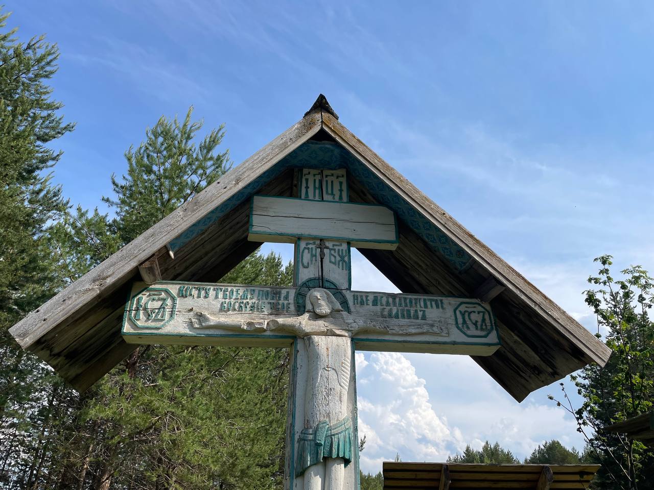 Вернулись вам Кимжу, оставили машину и прицеп в коровнике. Возвращались к лодкам через старое кладбище с большими деревянными крестами. Две бабули, возлежавшие прямо на тропинке, указали нам правильную дорожку, выведшую нас к обетному кресту, стоящему на берегу. На нем не только привычные аббревиатуры, но и барельеф Христа.