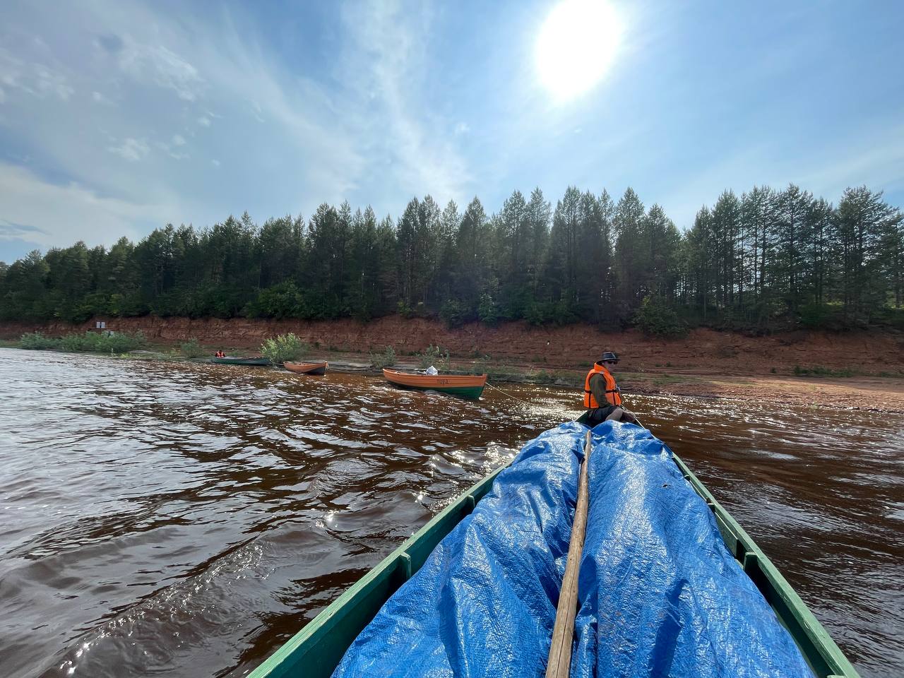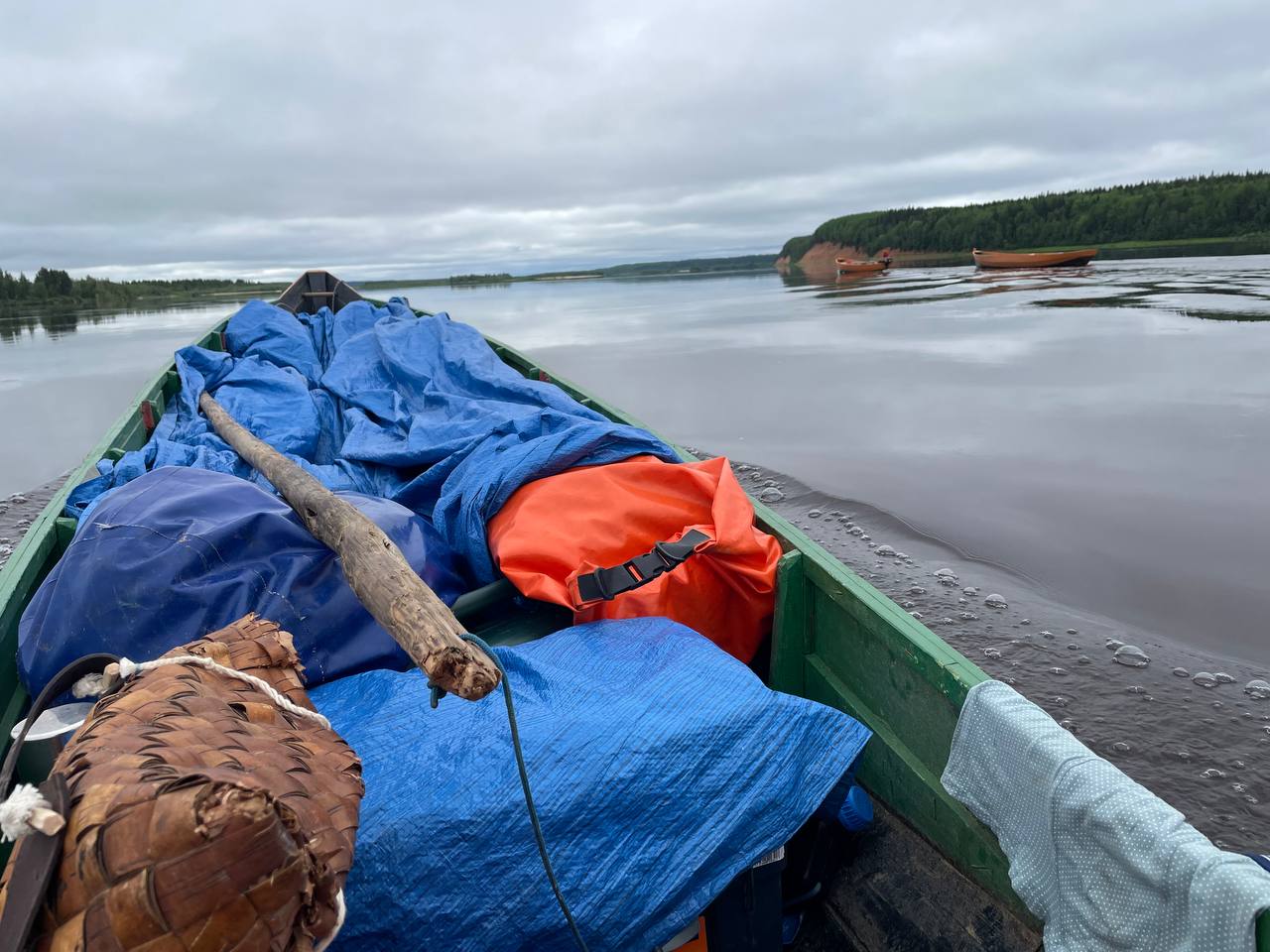 14:20 вышли из Кимжи. Караван из четырех лодок ведет на моторе Шорох с Мишанями. Замыкает Койду с Лехой. Он поправляет руль, вывалившийся из нижней петли. По прогнозу после обеда дождь. В него мы и идем. Пора, идущая второй не дает идти прямо, уводя нас своим килем в стороны. Река неспокойна, из-за большой воды стоит волна, особенно над мелями. Идем вдоль левого берега. Северный ветер чуть стих, когда мы оказались за берегом. Ищем место, чтоб перевесить мотор на Пору, этот маневр сэкономит нам время в пути.