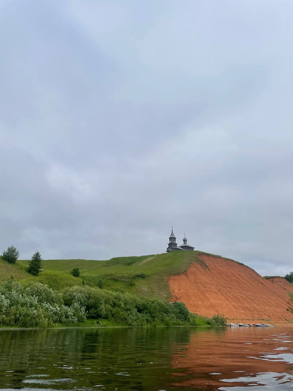 07:11 Мишаня уже пристал к берегу Усть-Нерманки, а я снова загнал нас с Лехой на мель. В моторе появился тревожный скрежет. В деревне видна церковь с лесами вместо колокольни