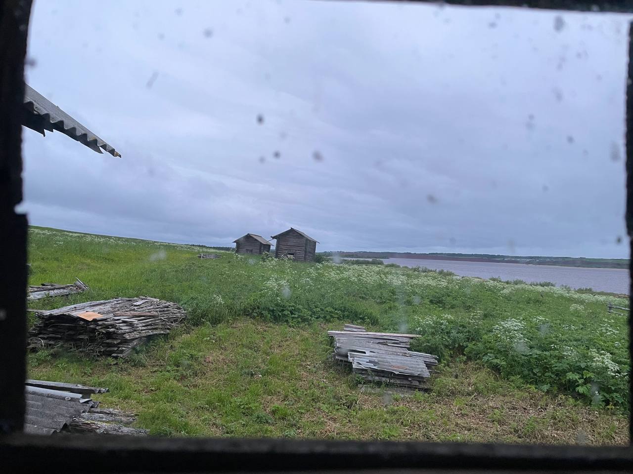 06:50 Мишаня на Поре далеко впереди. У меня разок не пойми отчего глох мотор. Видны первые дома Усть-Нерманки. А их тут как будто и всего три. Деревня по большому счету заброшенная. Только у рыбацкой избушки на краю деревни стоит синяя лодочка