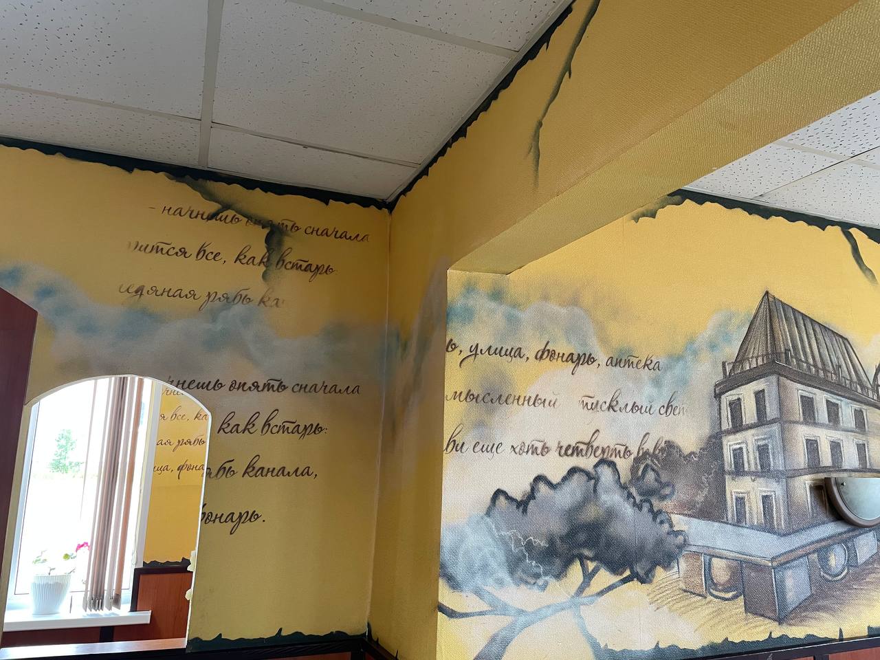 14:00 обедаем в Белогорском. стены кафе украшены стихотворением. одним и тем же стихотворением, написанным по трафарету.