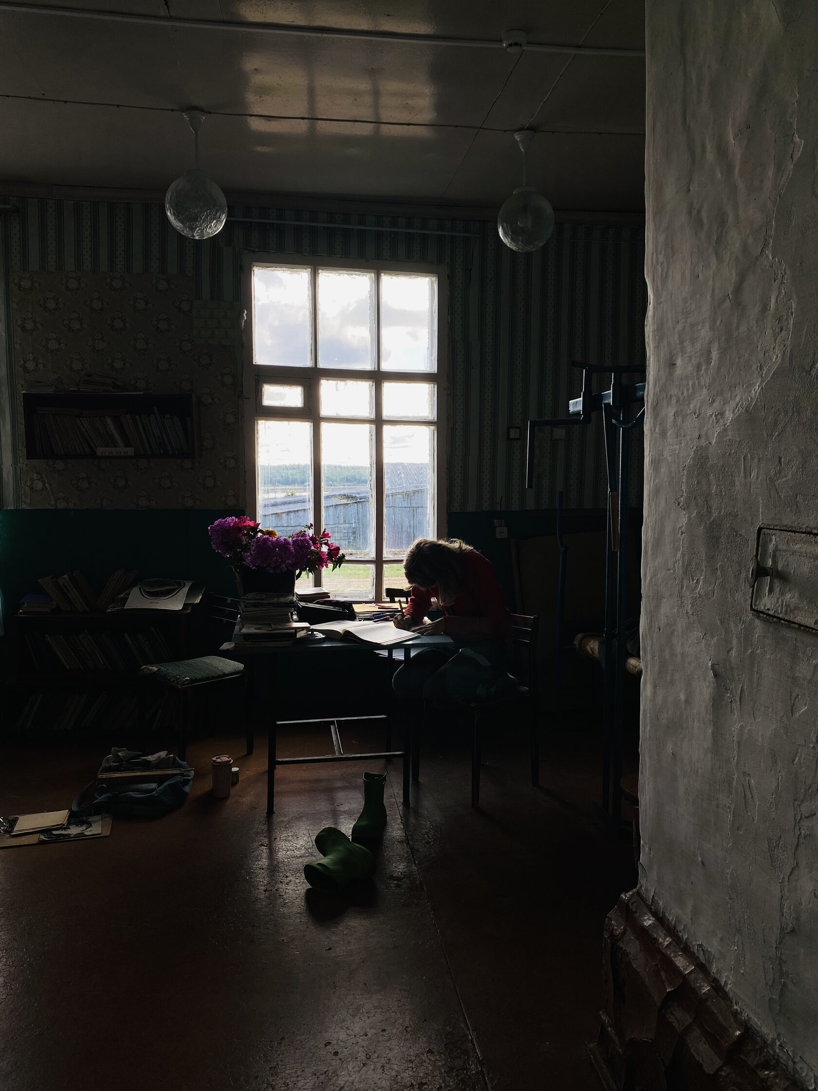 Это место располагает к рисованию: внутри просторно и увлекаительно — за счет сохранившегося инвентаря аналогового образования — всяких диафильмов, аппаратов, коллекций минералов, препарированный червей. А из высоких окон открываются самые вдохновляющие виды — азапольские амбары, поля и холмы.